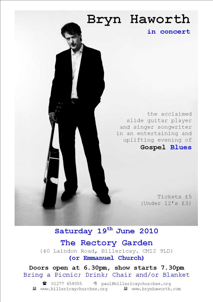 Come and join Bryn for a relaxed and ‘bluesy’ evening in the wonderful atmosphere of the Rectory garden (in Emmanuel church if the weather is poor). Doors open at 6.30pm, concert starts at 7.30pm – be sure to bring along a chair or blanket, a picnic and something to drink and something warm to wear as the evening draws to a close.