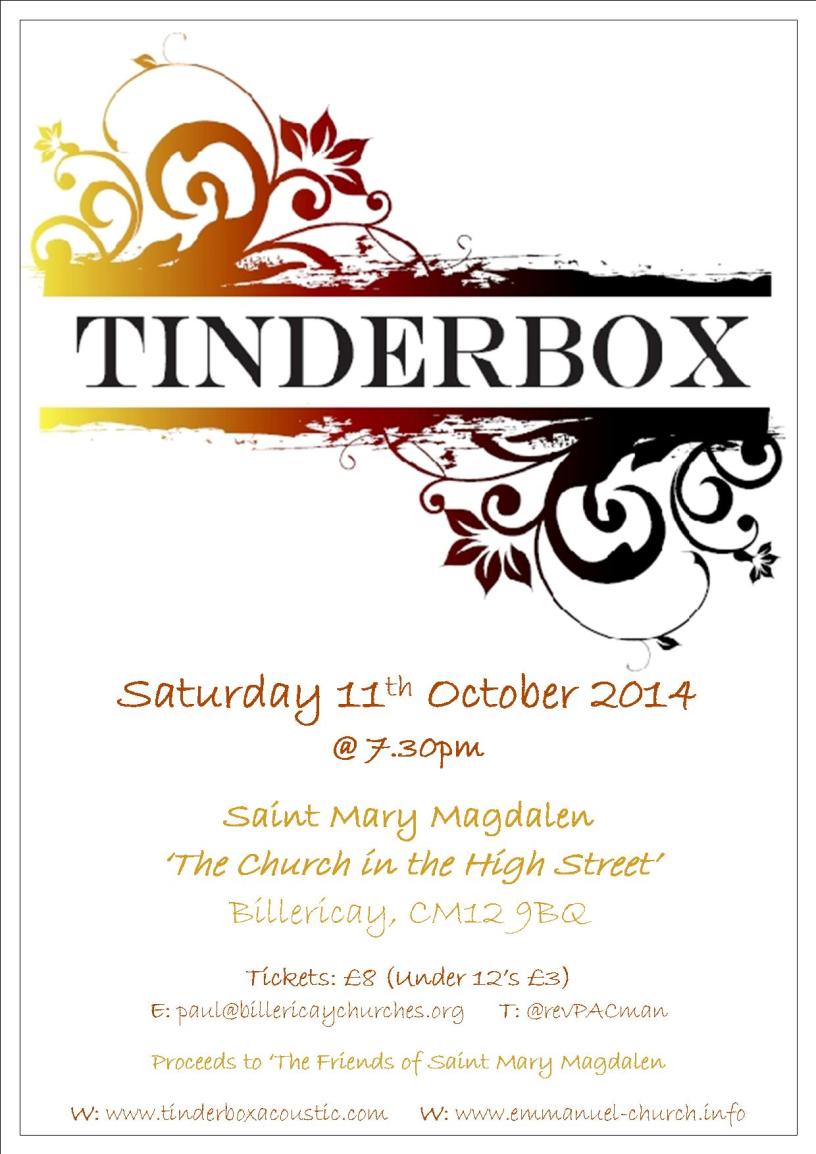 Numbers for this ‘Café Style’ gig (feel free to bring a bottle of wine or two) are limited so be sure to book your tickets by contacting Paul 01277 658055 paul@billericaychurches.org or send a SAE to: The Rectory, 40, Laindon Road, Billericay, CM12 9LD, with cheques made payable to Emmanuel DCC (all proceeds to ’The Friends of Saint Mary’s). For more details, check out their website http://www.tinderboxacoustic.com and keep up to date at http://www.emmanuel-info.org.