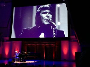 As the Seventies wore on, the two men’s fortunes were on the wane, but Webb concluded that he had been very fortunate that Campbell had so much faith in his material (the great man recorded more than eighty Webb compositions over the years). After another duet on ‘Postcard From Paris’ that Campbell recorded on his last studio album ‘See You There’ was followed by one of Webb’s most famous (and most hated as the man himself remembered) tracks ‘MacArthur Park’. One of Campbell’s favourite Webb songs, it usually enabled him to display his virtuoso guitar skills that we were able to witness thanks to a clip from the eighties cleverly inserted in the song by Webb. After a standing ovation, an emotional rendition of ‘Time Flies’ concluded the show while pictures of Webb and Campbell played in the background.
