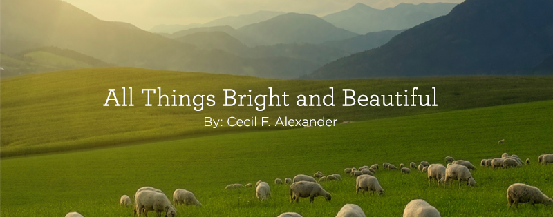 The words were written by Mrs Cecil Frances Alexander (1818-1895) who was inspired to write this hymn when trying, with great difficulty, to teach a group of children the meaning of the Apostles’ Creed. She decided to write a series of hymns, based on various phrases of the Creed, when traditional teaching methods failed. She based this hymn on the phrase: “I believe in God, the Father Almighty, maker of heaven and earth.”