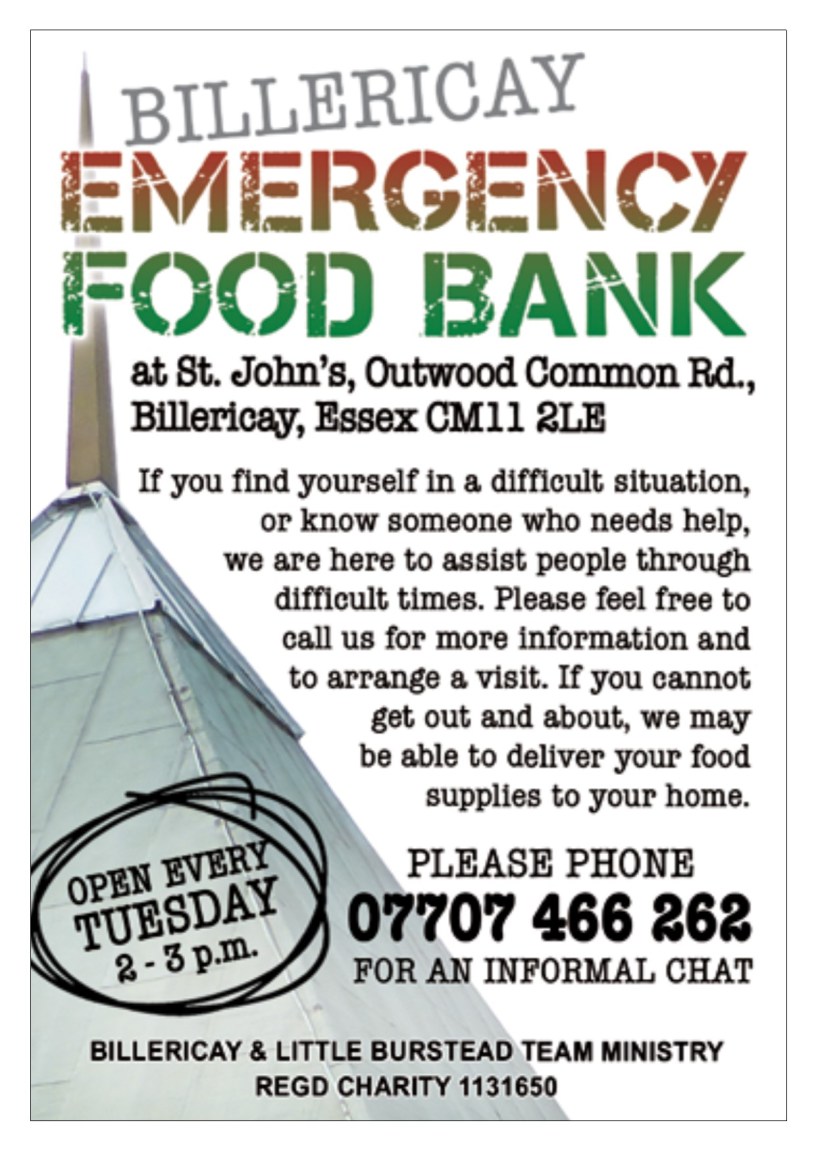 The Billericay & Little Burstead Team Ministry (Anglican Churches in Billericay) have opened an Emergency Food Bank, to provide food and other household items to anyone in hardship in the town. Hardship in this context means that they do not have food to feed their family and do not have money to buy food. The food bank store will be at St. John’s church, Outwood Common.