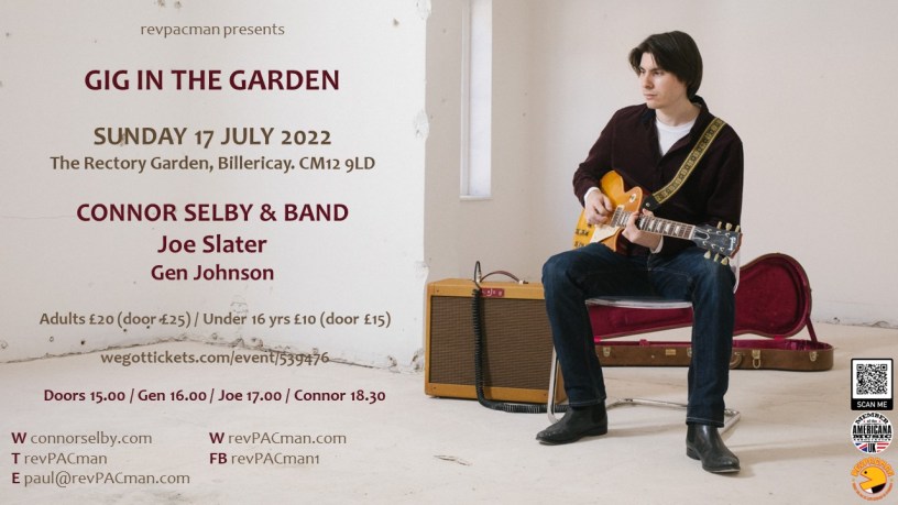 My eleventh annual Gig in the Garden takes place on Sunday 17 July 2022. We have three great artists to enjoy with a mixture of Blues/Rock/Soul/Americana and classic songs as we welcome to Billericay the fabulous Connor Selby and his band, supported by (and back by popular demand) the wonderful Joe Slater and upcoming Billericay artist Genevieve Johnson. It really is an extremely talented line up.