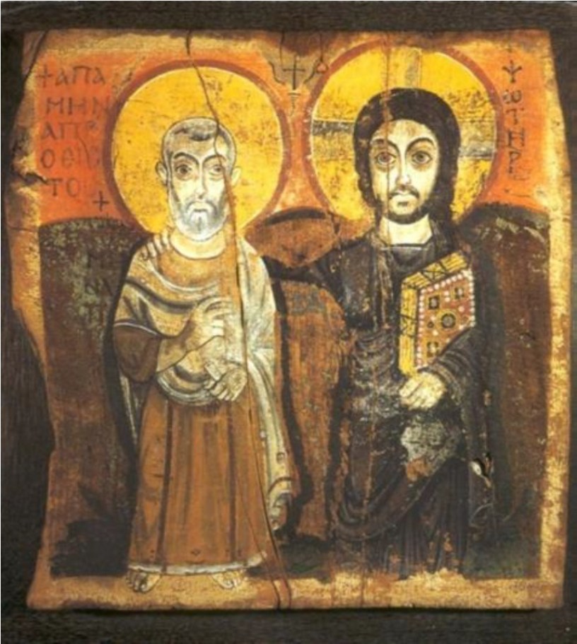 Christ, to the right, is slightly taller than the figure on the left; the inscription ‘Saviour’ is written near him. In a sign of introduction and as a protective gesture, his right hand is placed on the left shoulder of Saint Mena, who can be identified by the inscription placed to the left of his halo, ‘Apa Mena superior.’