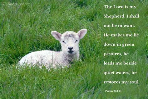 Vs1-2 ‘The LORD is my shepherd; I shall not be in want. He makes me lie down in green pastures, he leads me beside quiet waters, he restores my soul.’