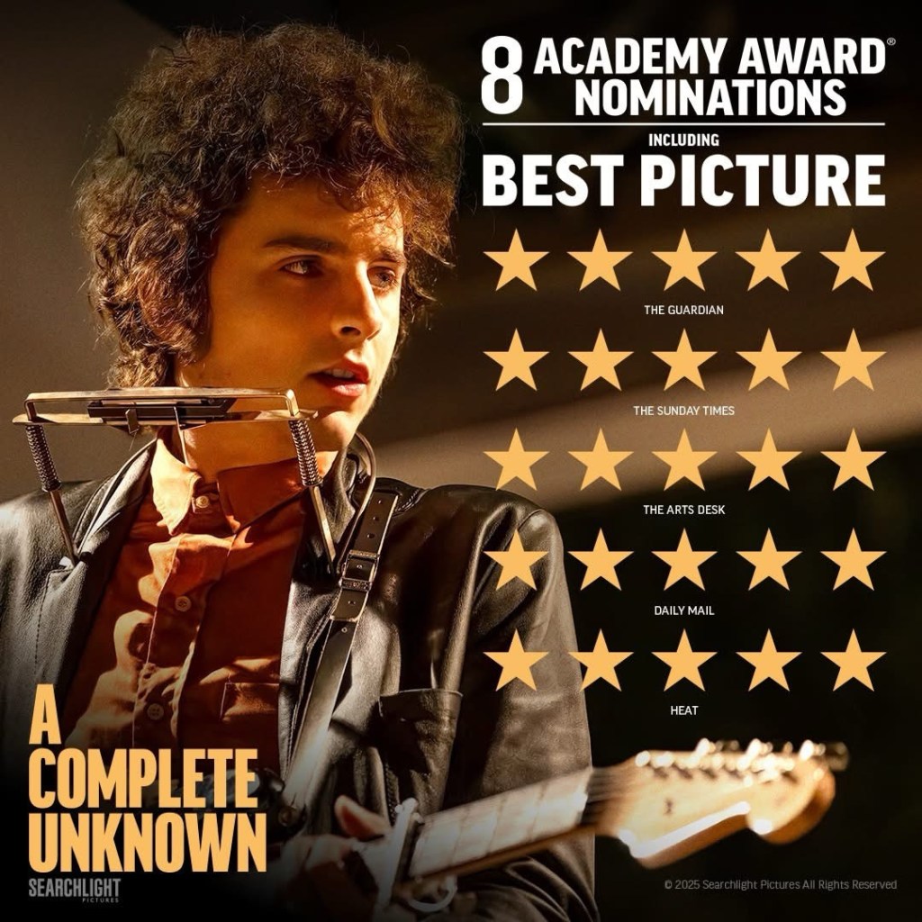 ‘A Complete Unknown’ chronicles the early days of Bob Dylan’s career from 1961 – 1965. From his arrival in New York as an idealistic 19 year old with a guitar and a handful of songs to his rise to fame and his infamous appearance at the 1965 Newport Folk Festival. The film stars Timothee Chalamet as the young troubadour himself.
