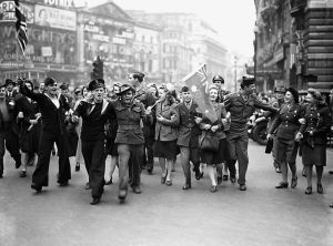 Across the Allied world, millions celebrated, relieved that years of conflict and extraordinary hardship were finally coming to an end. More than one million people poured onto the streets of the United Kingdom in celebration. In London, huge crowds, many dressed in red, white and blue, thronged the city’s monuments and gathered outside Buckingham Palace to cheer as the King and Queen appeared eight times on the balcony over the day and into the evening.