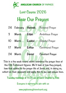 The 2026 Lent Course for the Anglican Church of Paphos is entitled ‘Hear Our Prayers’. This course will last for five weeks and will be launched in the Parish on Ash Wednesday 18 February. We will meet on Tuesday mornings from 11.00 am to 12.15 pm at Saint Stephen’s, Tala, from 24 February to 24 March. Directions to Saint Stephen’s can be found here